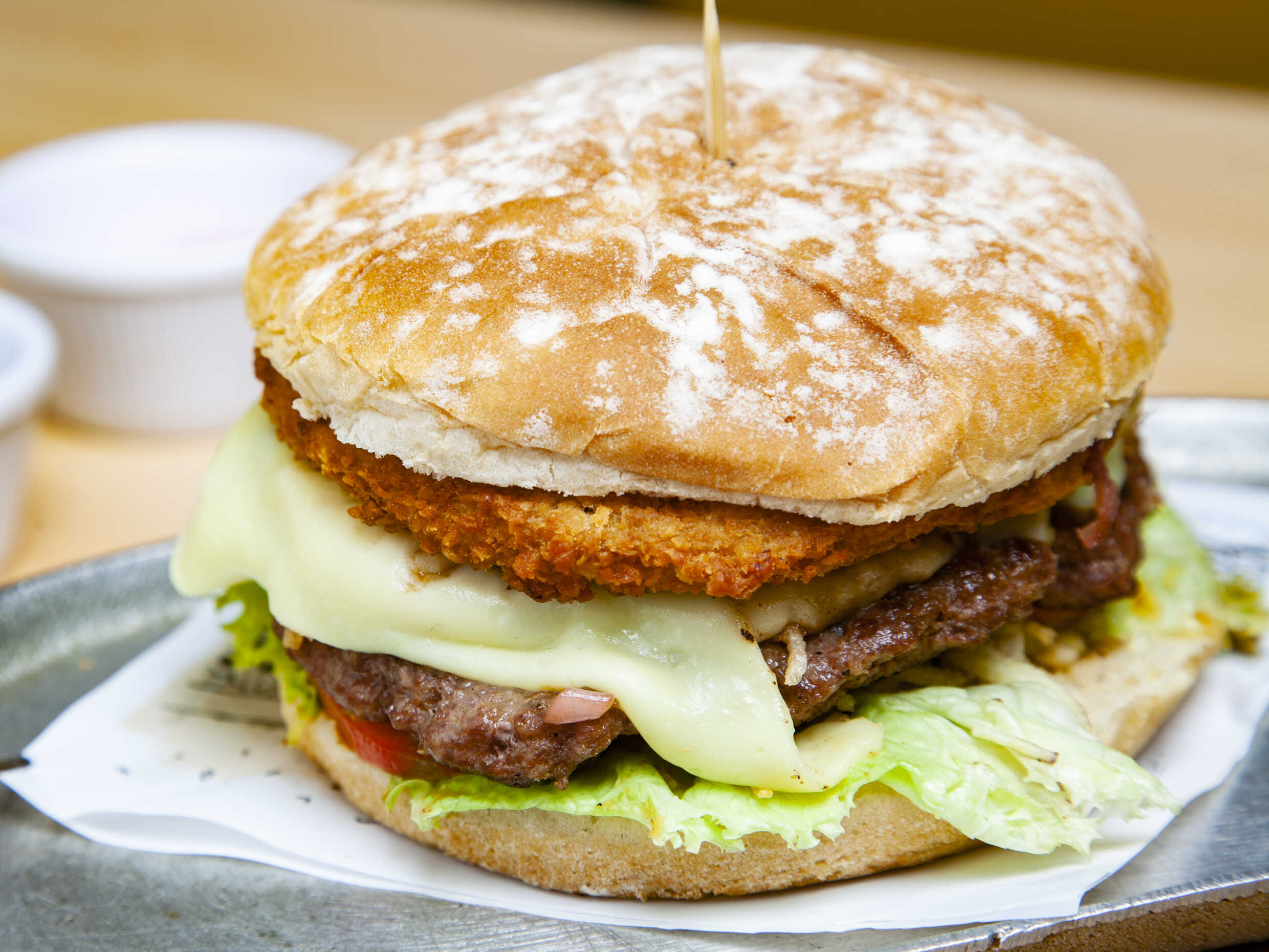 Un cuarto de carne 100% de res, pollo apanado, pan, cebolla caramelizada, lechuga, tomate, queso y papa chips.