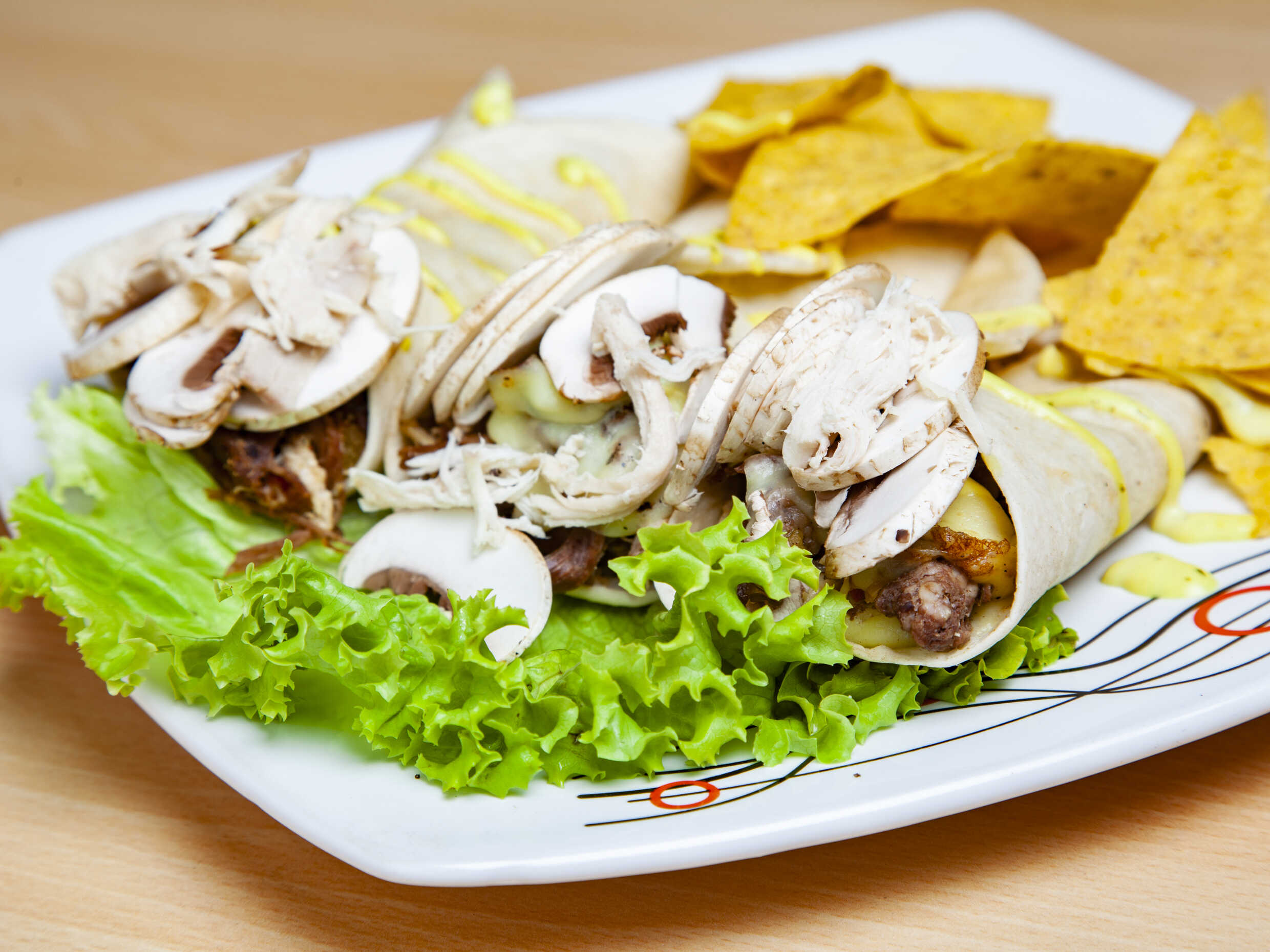 3 Deliciosos burritos con tortilla de trigo, pollo, champiñones, queso, frijol, lechuga, pico e gallo, guacamole y totopos.