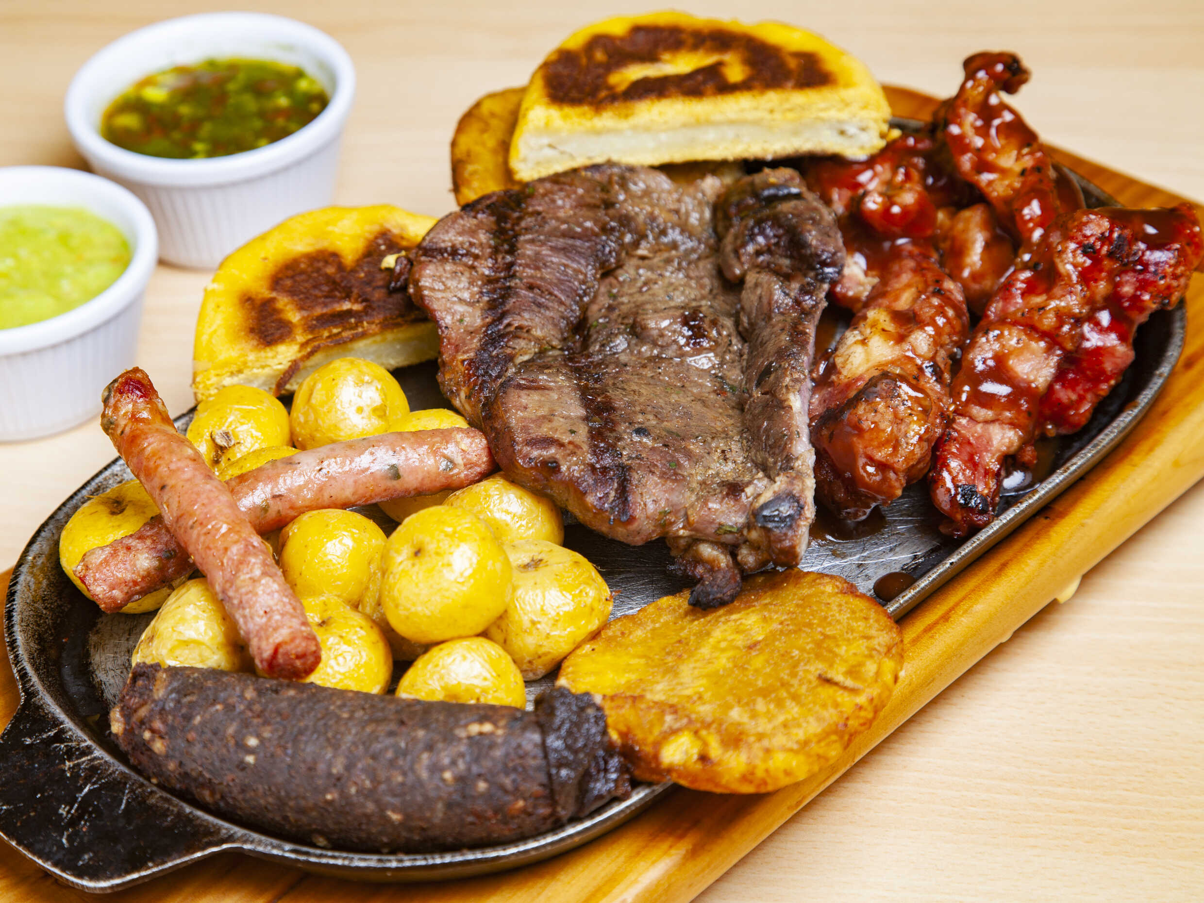 Churrasco, loganiza, rellena, costillas, arepa boyacense, papa criolla, guacamole y chimichurry