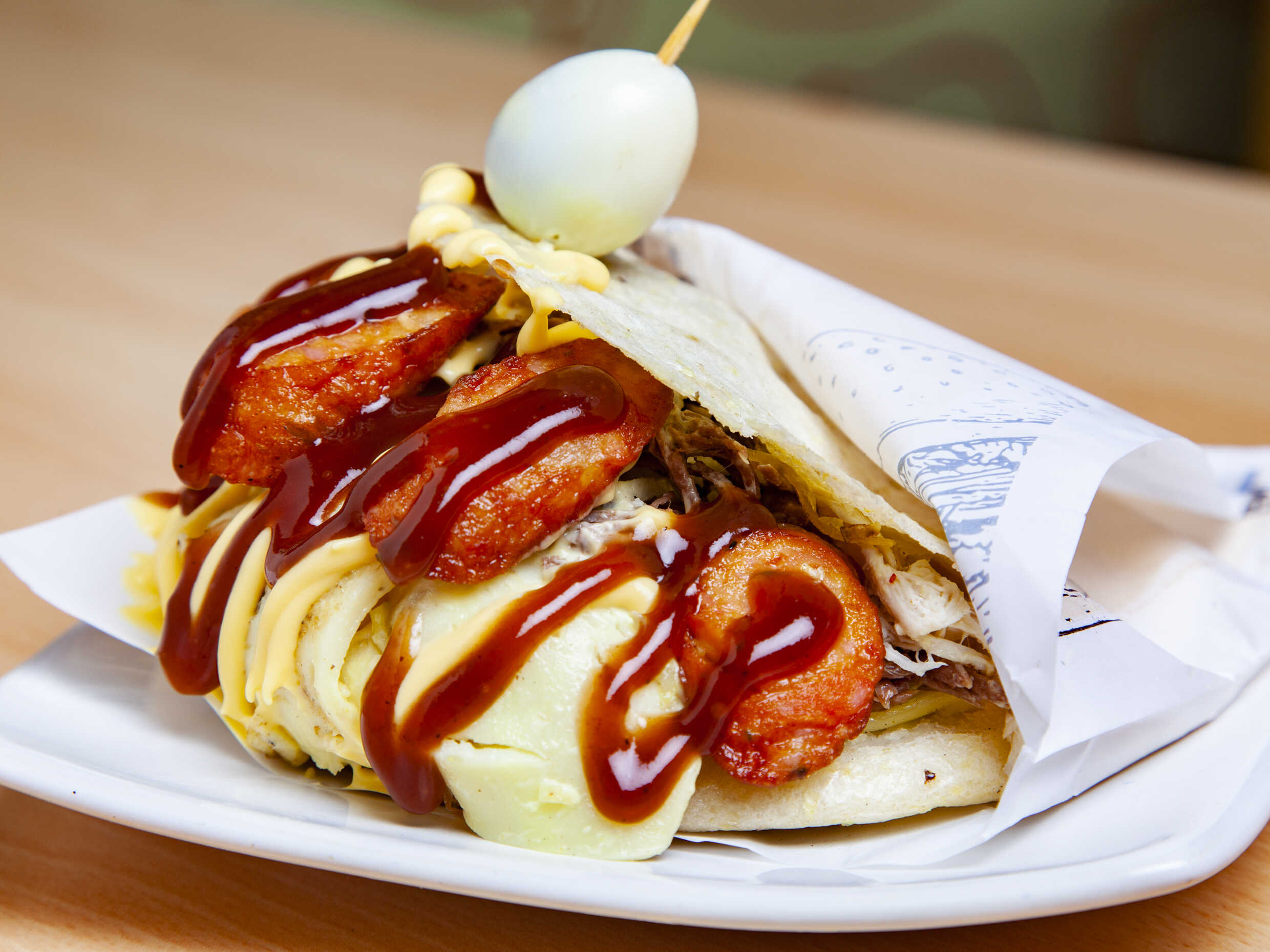 Arepa con carne, pollo, queso y huevo de codorniz.