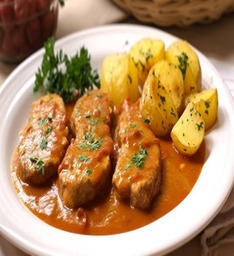 Lomo de cerdo de 250 g bañado en una deliciosa salsa criolla con especias, acompañado de porción de papas a la francesa, arepita frita y ensalada de la casa.