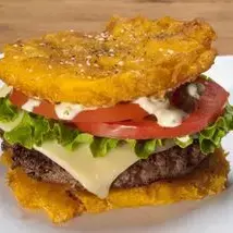 Elige si deseas pan o patacón, carne artesanal de 220 g, chicharrón crocante, chorizo, huevo frito, tajadas maduras, queso, jamón y vegetales (tomate, lechuga y cebolla caramelizada).