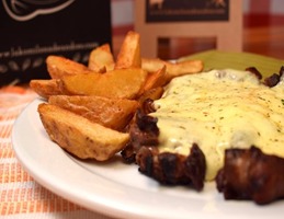 Churrasco de 250 g gratinado, acompañado de porción de papas a la francesa, arepita frita y ensalada de la casa.