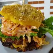 Elige si deseas pan o patacón, carne artesanal de 125 g, carne desmechada 125 g, queso, jamón, papa chip y vegetales (tomate, lechuga y cebolla caramelizada).