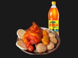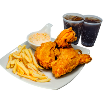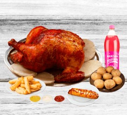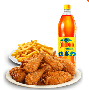 1 pollo frito, papa salada + arepa + Papas al la francesa + gaseosa 1.5 L.