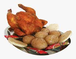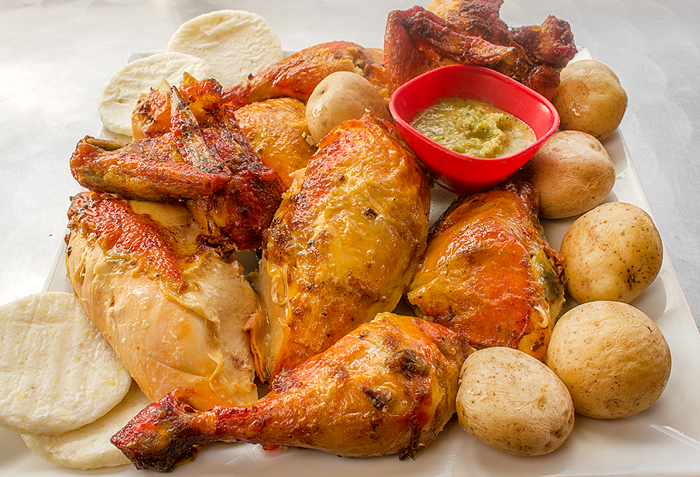 1/2 pollo asado, 4 papas saladas y 2 arepas.