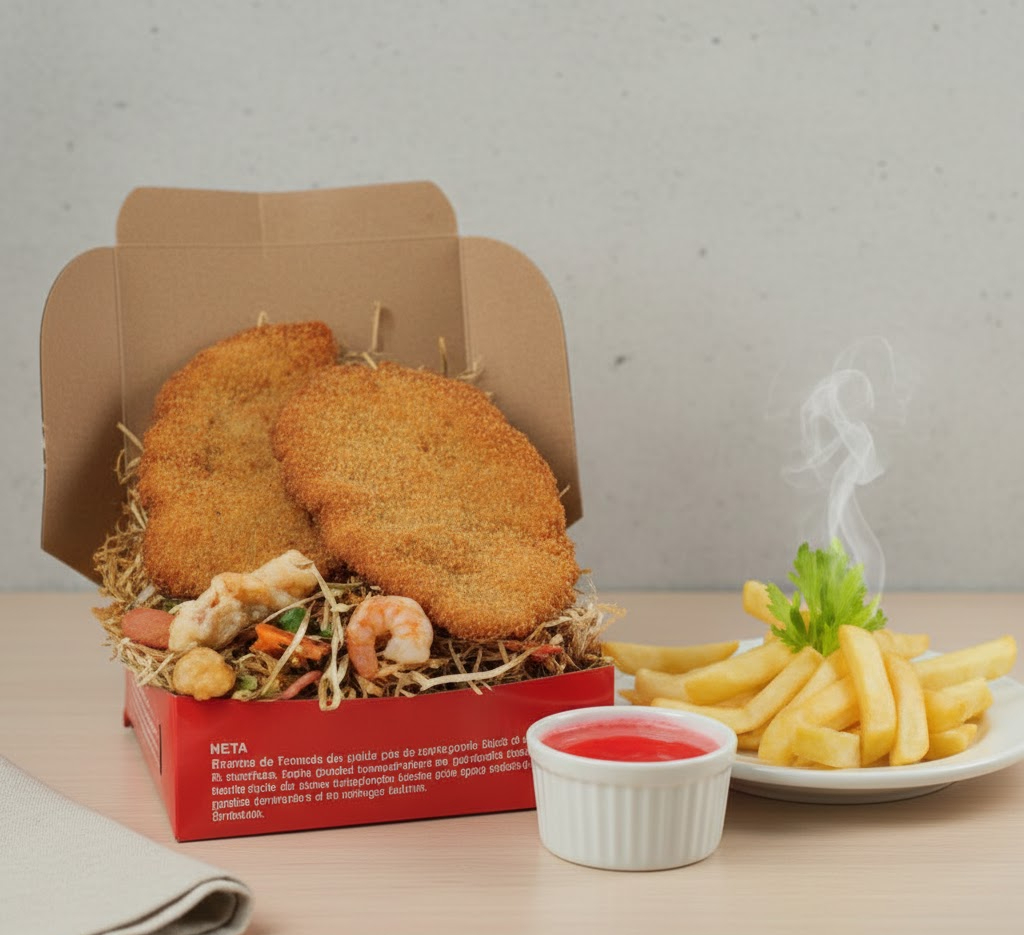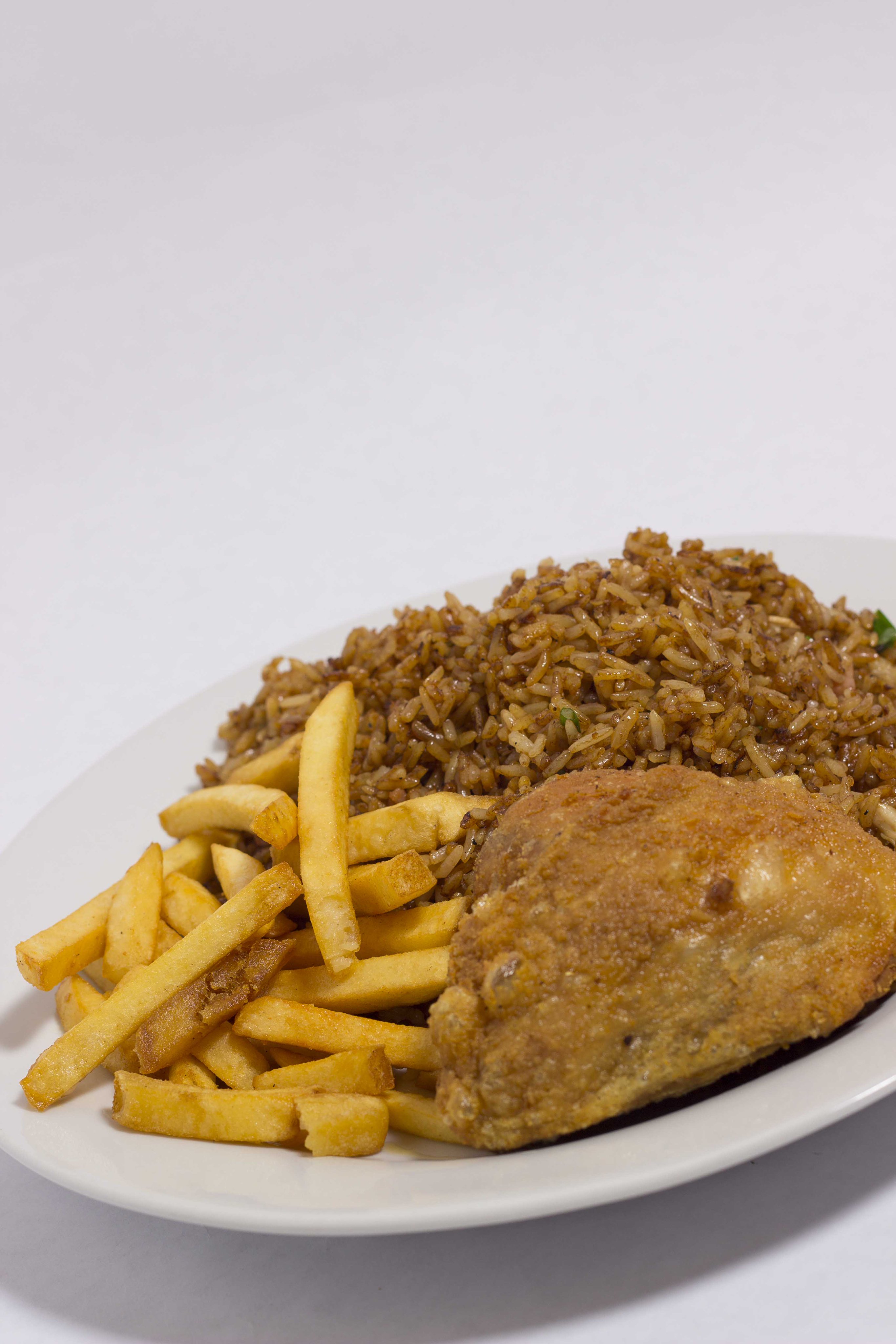 Lomo, pechuga, papa a la francesa, arroz y ensalada.