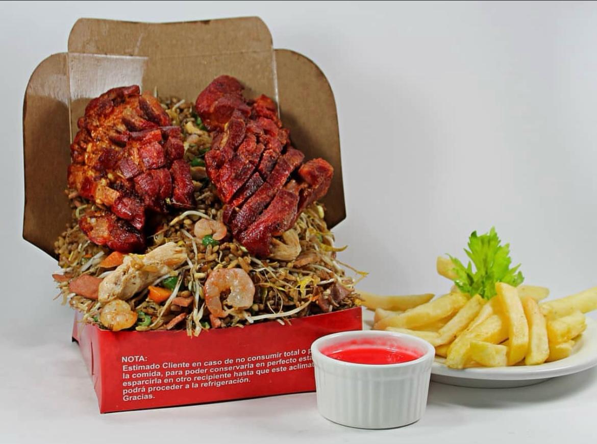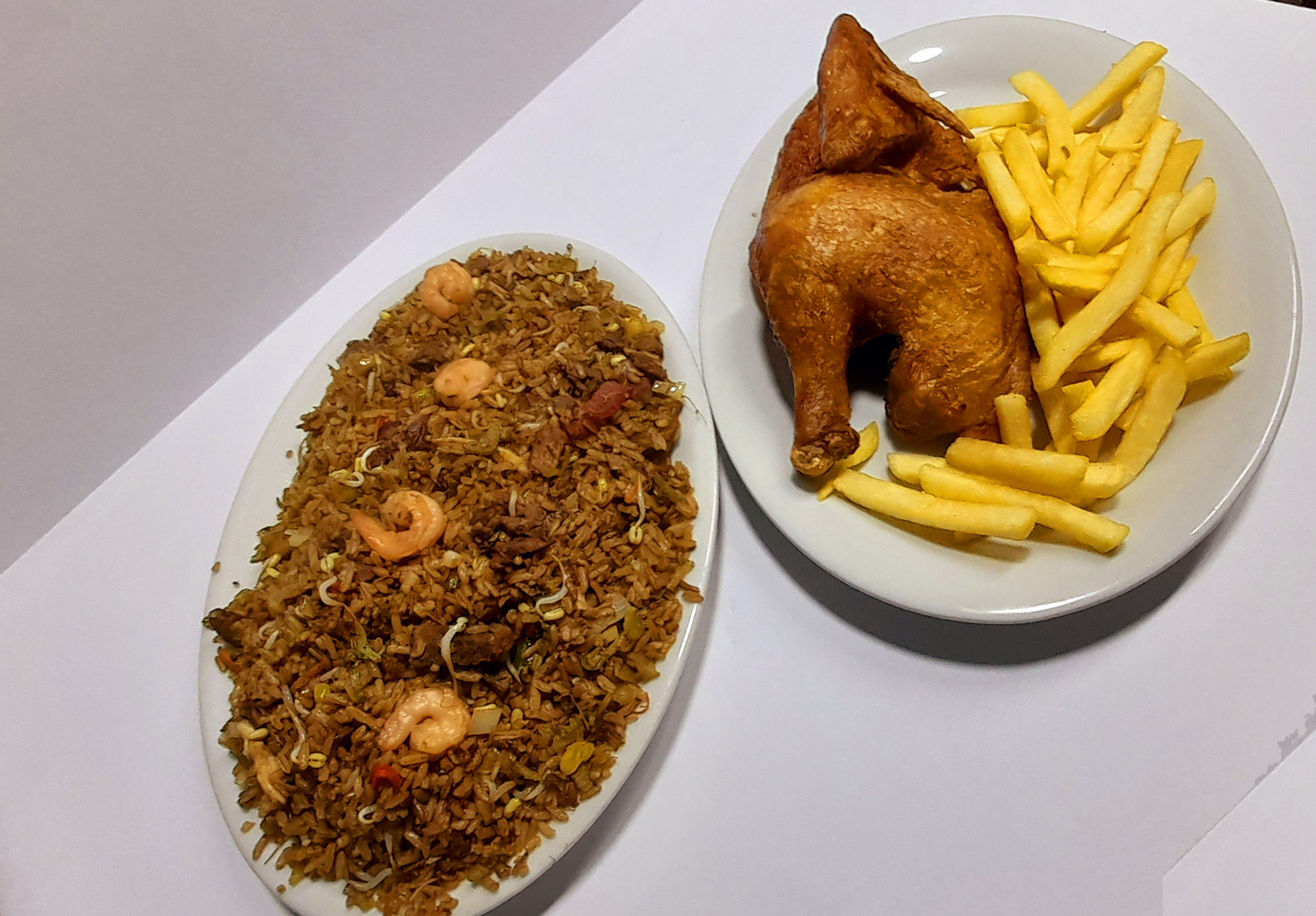 Delicioso arroz chino salteado al wok, jamón en trozos y raíces chinas + 2 porciones de papas a la francesa + 1/2 Medio Pollo Broaster + Gaseosa 1Lt