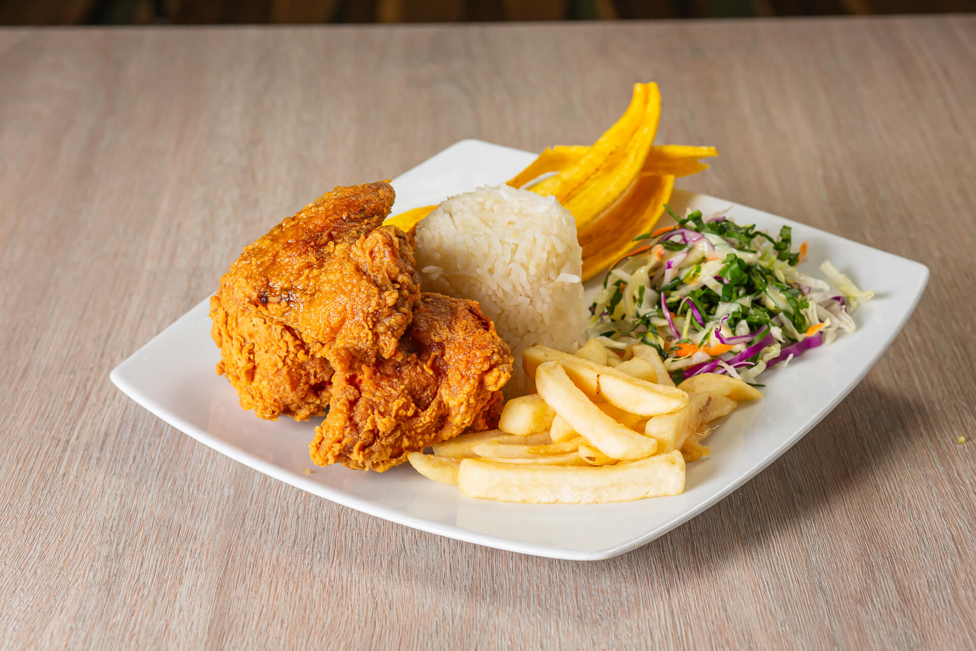 Pollo broaster acompañado de papas a la francesa y 4 arepas.