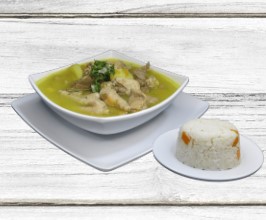 Ajiaco con pollo, pierna pernil broaster, mazorca, aguacate y arroz porción