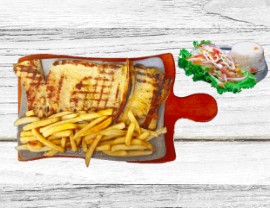 Pechuga a la plancha + papa a la francesa, arroz y ensalada.