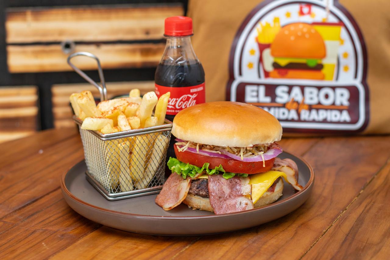 PAN-CARNE ARTESANAL-TOCINETA -QUESO CHEDAD -TOMATE -LECUGA Y CEBOLLA