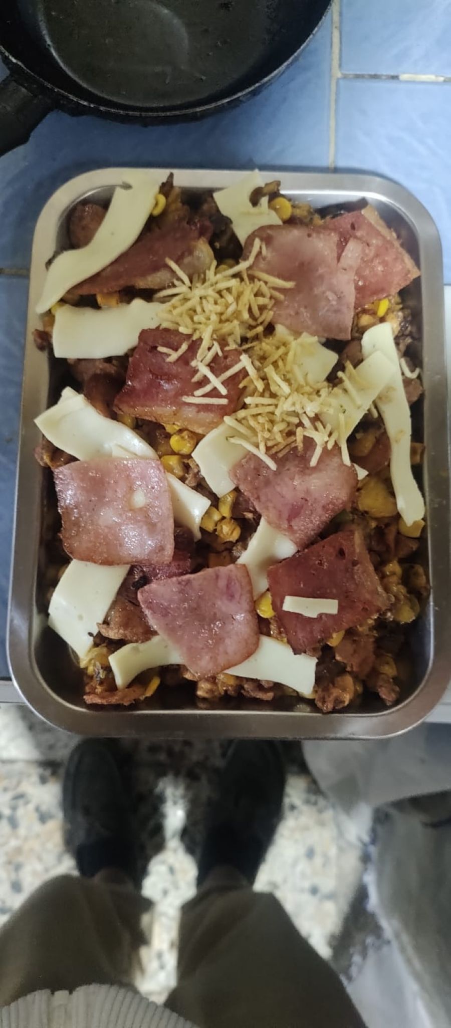 Mazorca, queso, pollo, carne, papa chip, huevo de codorniz, tocineta picada y salsa de maíz.