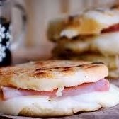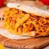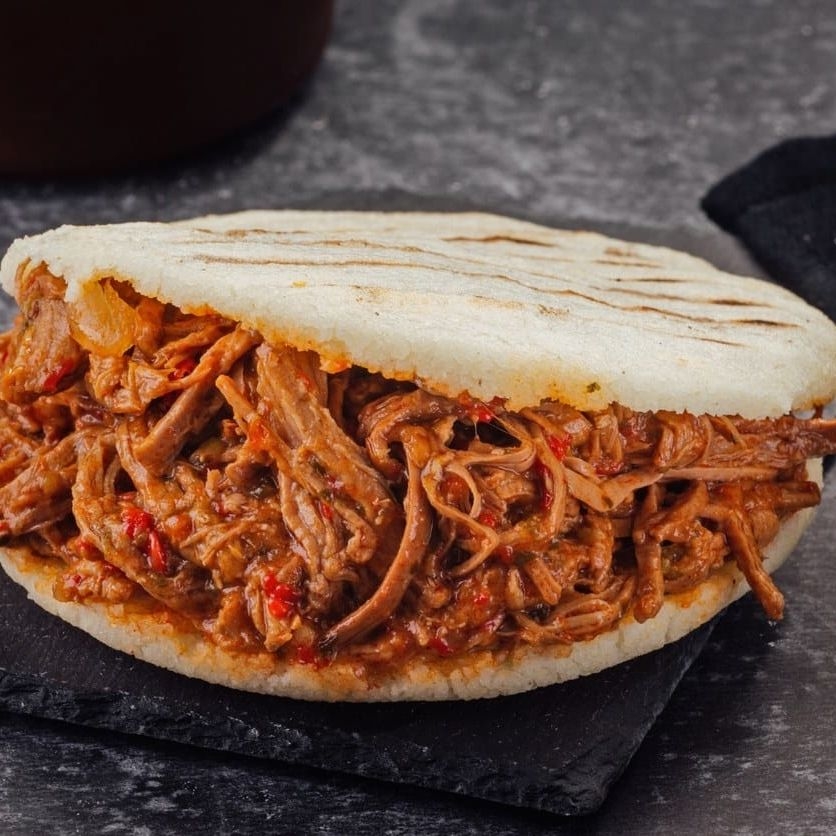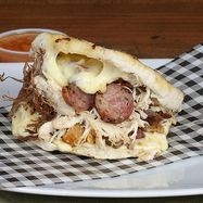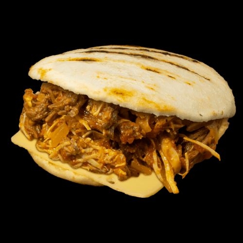 Arepa rellena de pollo, carne, queso y salsas al gusto.