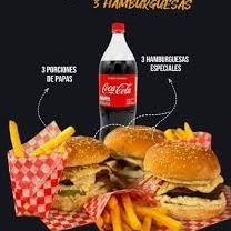 Tres hamburguesas sencillas con 3 papas a la francesa y 3 gaseosas 250 ml.