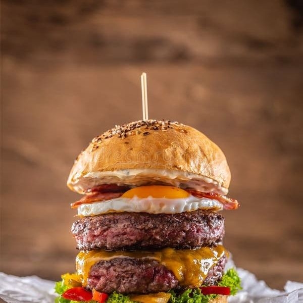 Dos carnes de res, queso, lechuga, tomate, cebolla caramelizada, papa chip, tocineta, mortadela, huevo de codorniz y salsas.