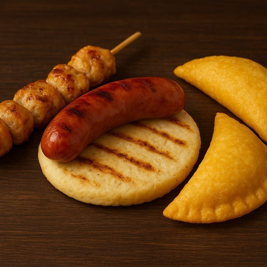 Pincho de Pollo*1 + Chorizo con Arepa*1 + Empanada*2