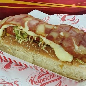 Chorizo, cebolla caramelizada, lechuga, papa chip, tocineta, mortadela, huevo de codorniz y salsas al gusto.