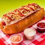 Salchicha americana, cebolla caramelizada, lechuga, papa chip y salsas al gusto.