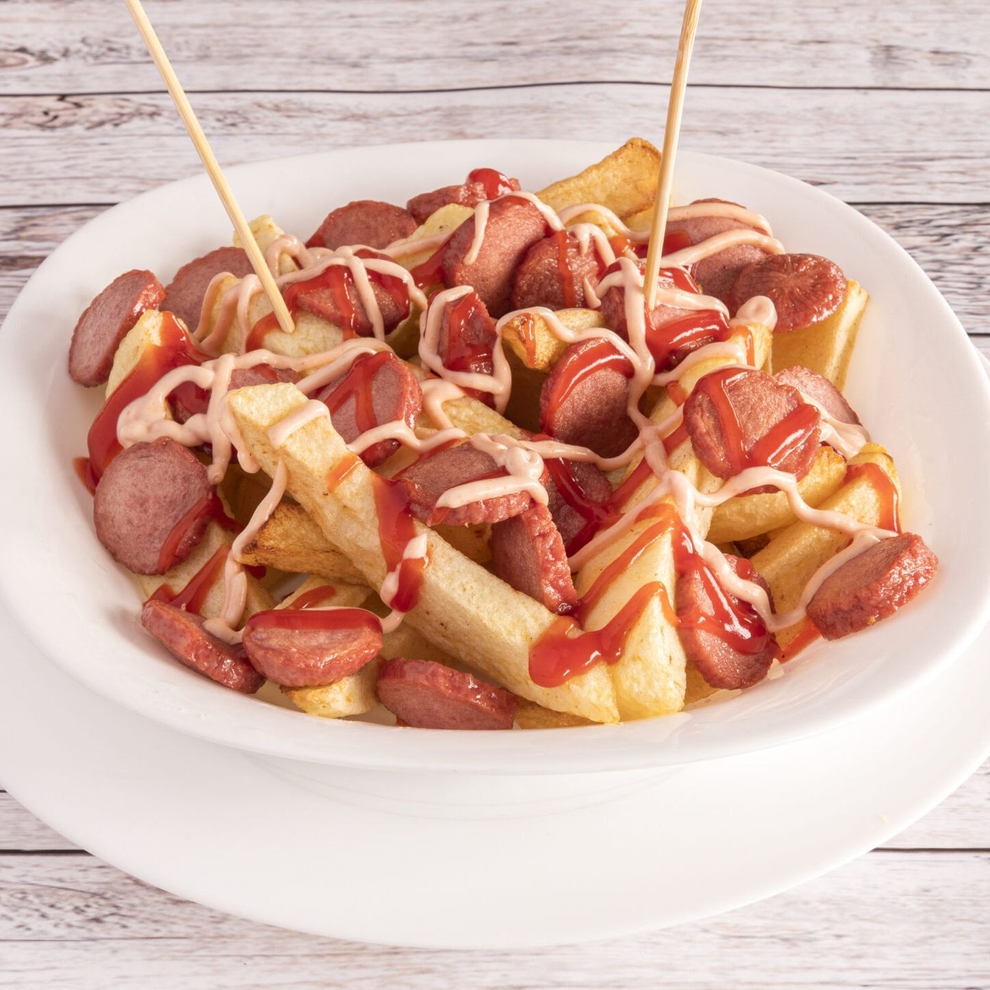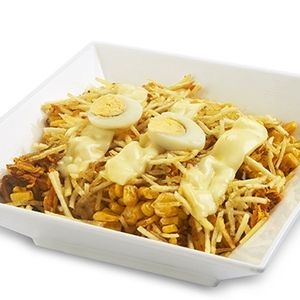 Papa, salchicha, lechuga, queso, huevo de codorniz, carne o pollo y salsas al gusto.
