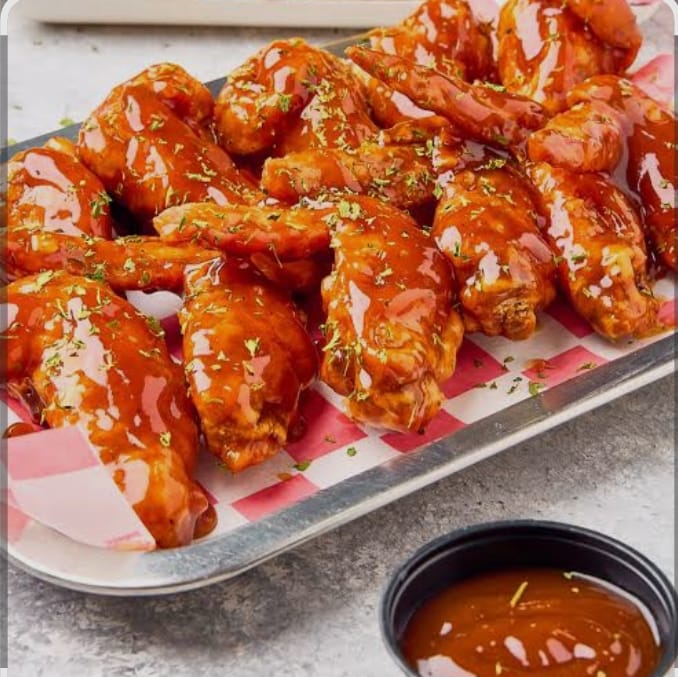 12 Deliciosas piezas de alas bañadas en BBQ, acompañado de papas francesas o papa criolla.