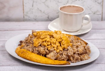 Calentado acompañado de huevos al gusto (con cebolla y tomate o huevo frito o huevo revuelto), tajadas de plátano y bebida a elegir (chocolate o café con leche o limonada).