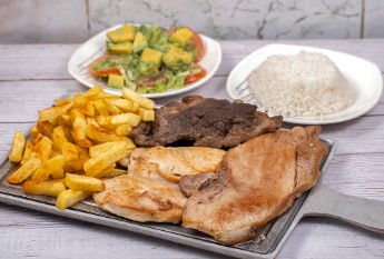 Pollo, carne de res y cerdo, arroz, ensalada, papa a la francesa.
