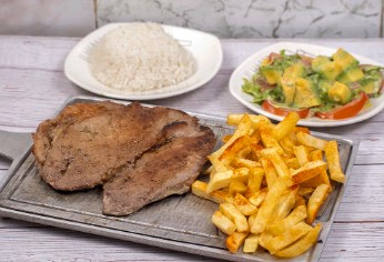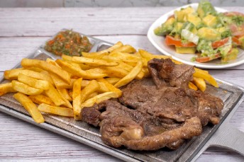 Churrasco con arroz ensalada y papa a la francesa.
