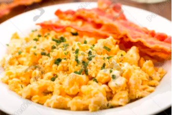 Huevos con tocineta, queso y maíz dulce.