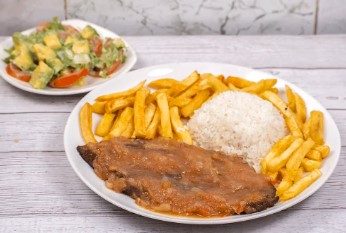 Filete de carne con arroz, ensalada y papa a la francesa.