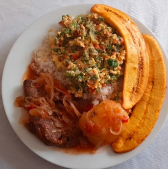 Bagre (bagre en salsa o bagre a la plancha), con arroz, ensalada, acompañamiento a elegir: (papa en salsa o patacón o papa francesa).