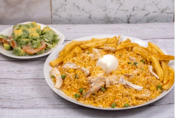 Arroz con pollo acompañado de ensalada y papa a la francesa.