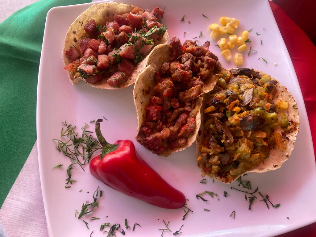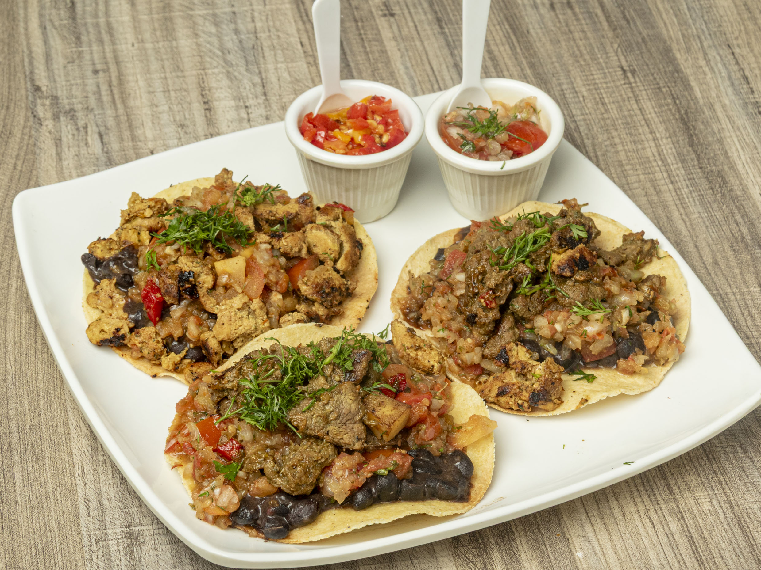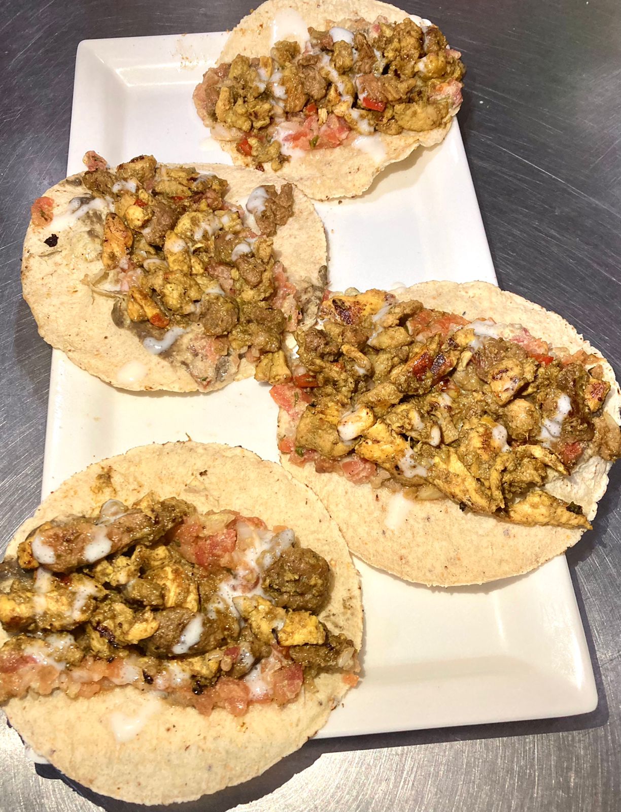 Tortilla de maíz de 13 cm de diametro, rellena con 50 gr de res, pollo, cerdo o mixto en su salsa, de gallo, frijol refrito y sour cream, opcional picante habanero o jalapeño