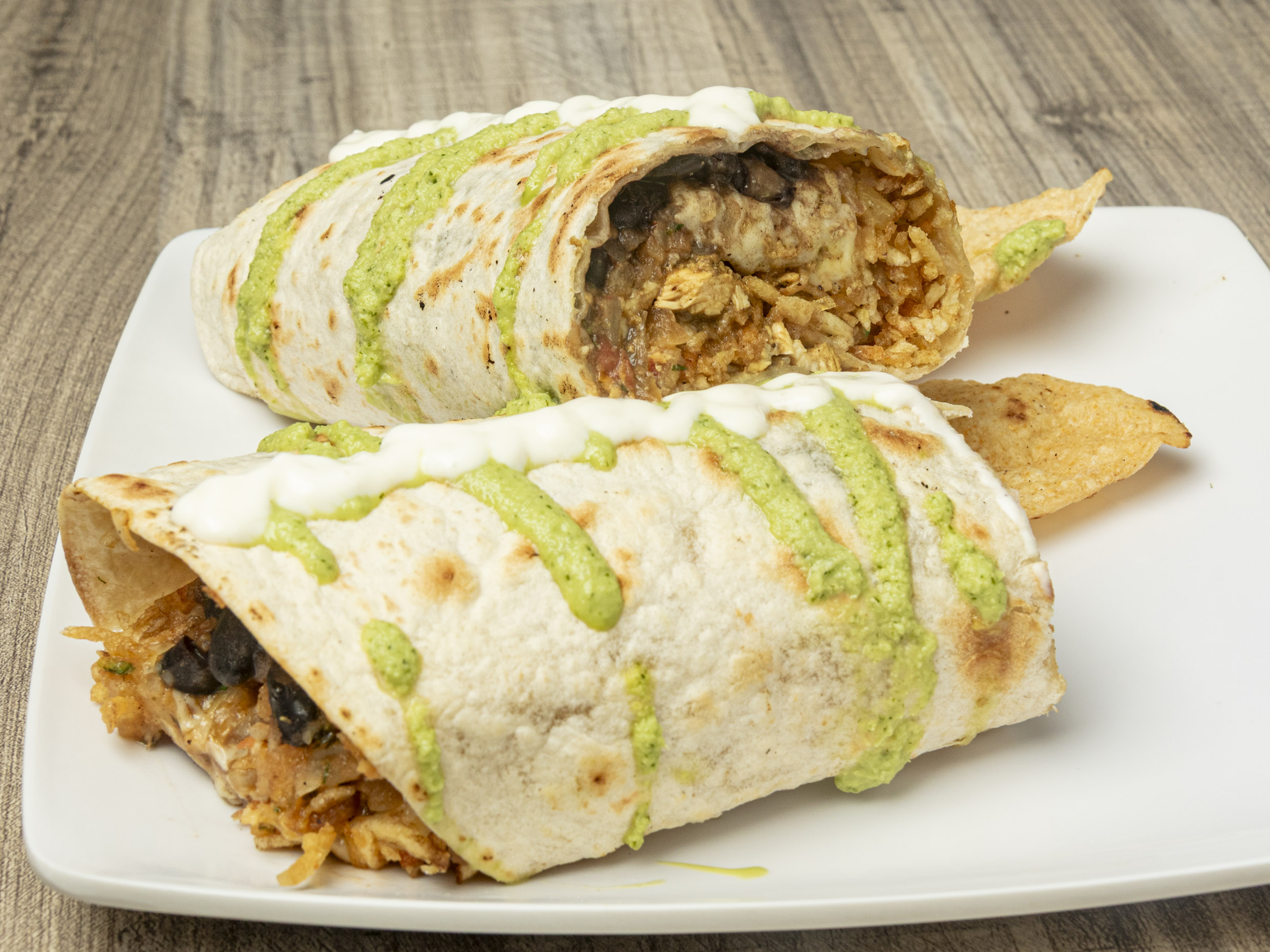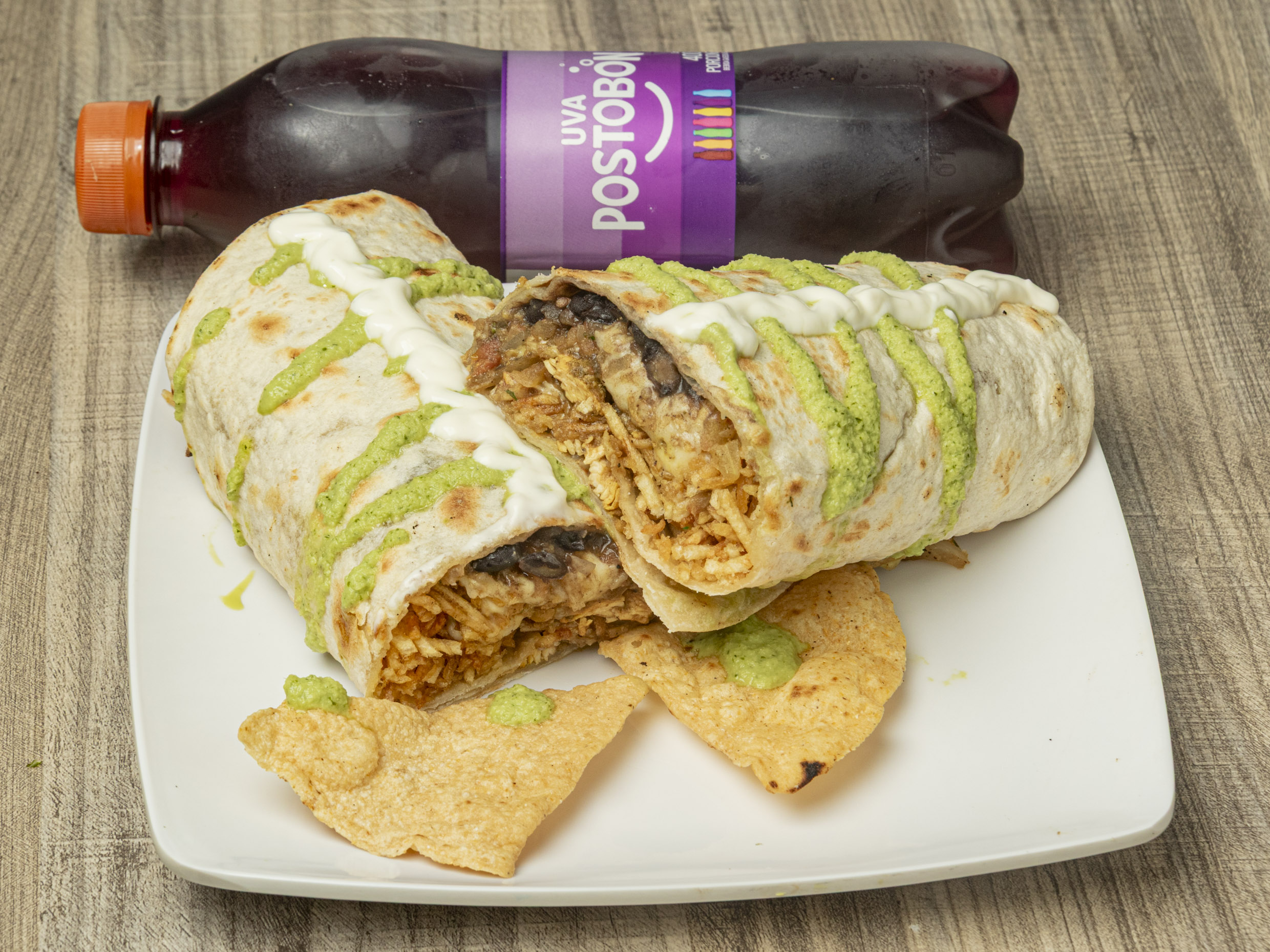 Tortilla de trigo de 21 cm de diametro rellena con (110 gramos) de pro cerdo, res, pollo o mixto de dos carnes en su salsa, pico de gallo, pimenton, arroz o papa fosforo y sour cream. Acompañado de totopos y frijol refrito. Opción de picante habanero o jalapeño