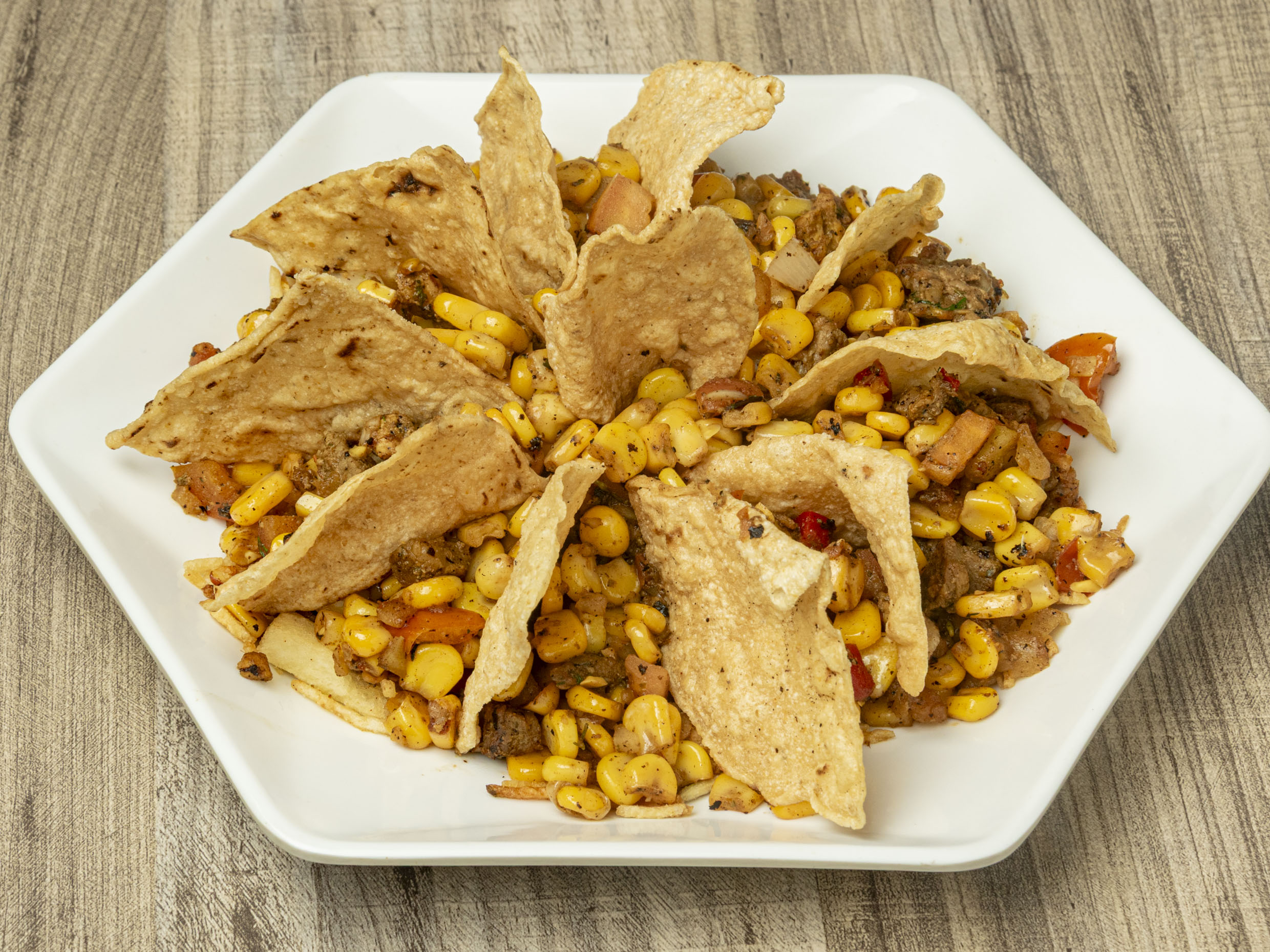 Cama de nachos acompañados de res, cerdo, pollo o mixta de dos carnes en su salsa, maíz, frijol refrito, pico de gallo y pimentón. Opción de picante o jalapeño