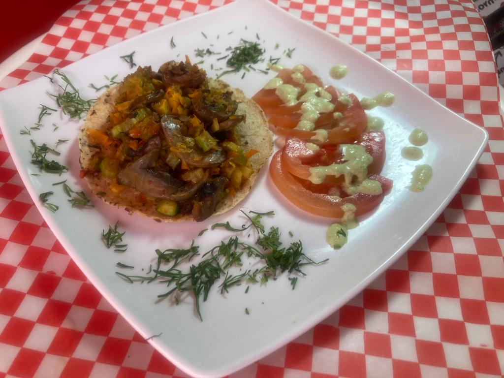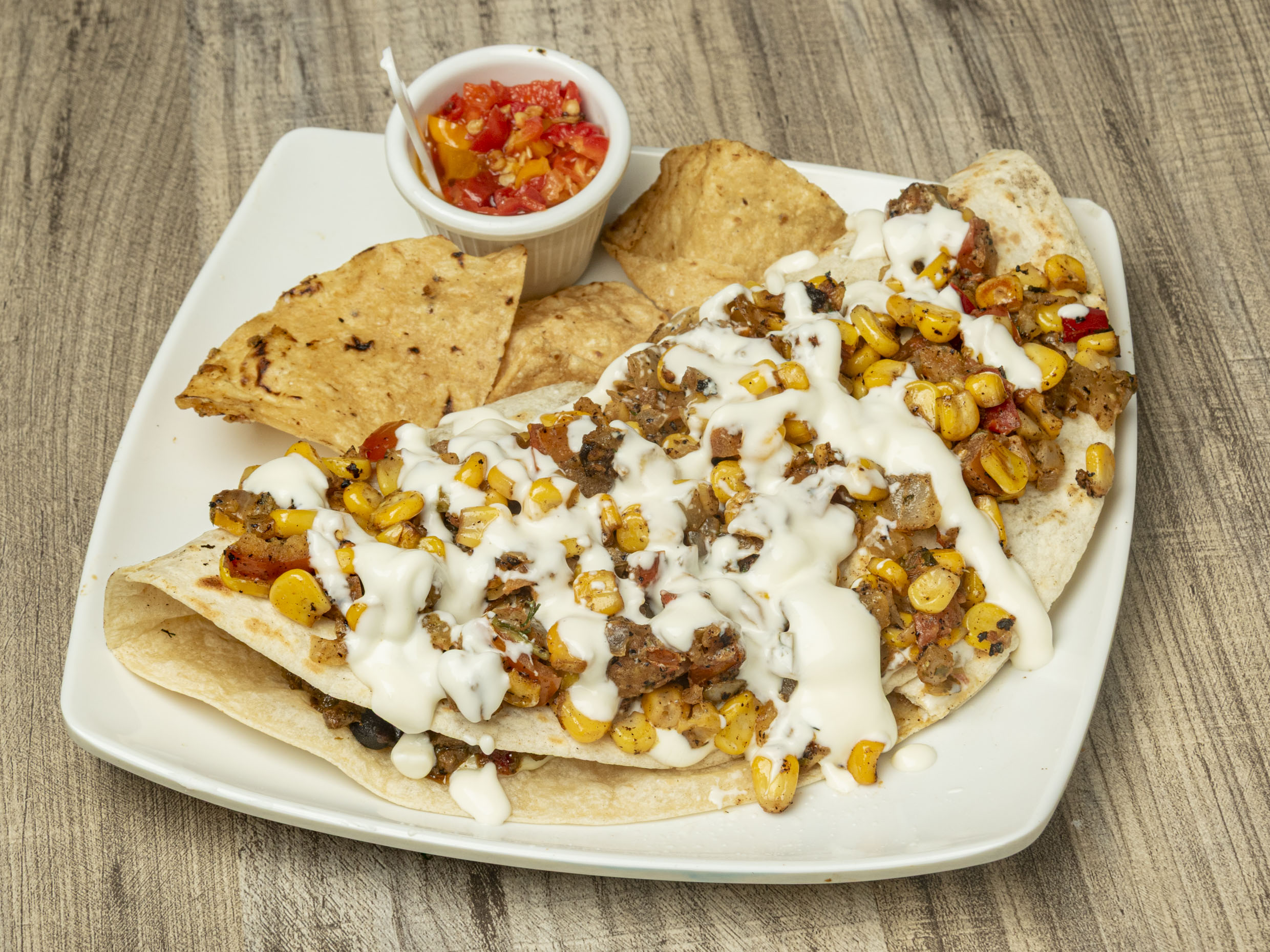 Tortilla de maíz de 13 cm de diametro, rellena con 110 gr mixto de verdura, champiñón, pico de gallo, frijol refrito y sour cream.
