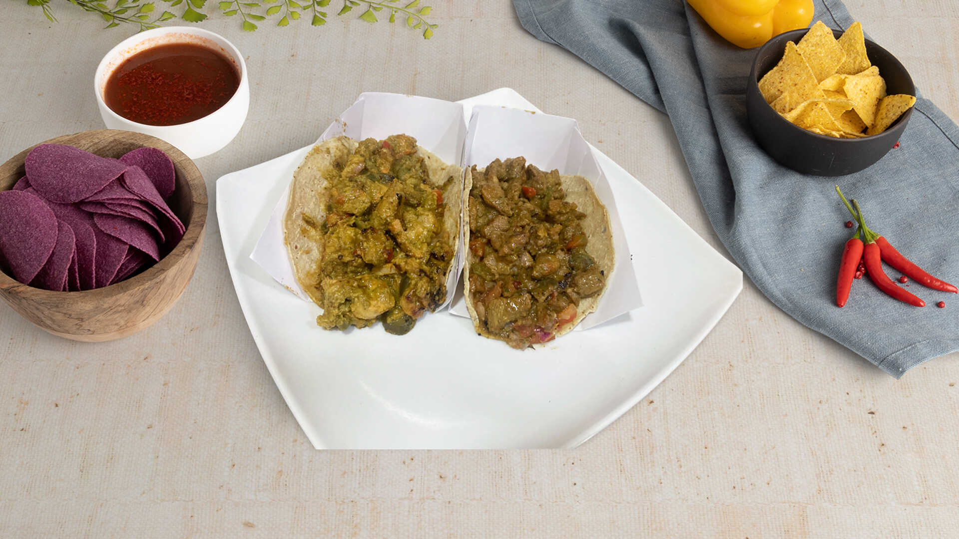 Tortilla de maíz de 13 cm de diametro, rellena con 50gr de res, pollo, cerdo o mixto en su salsa, pico de gallo, frijol refrito y sour cream.