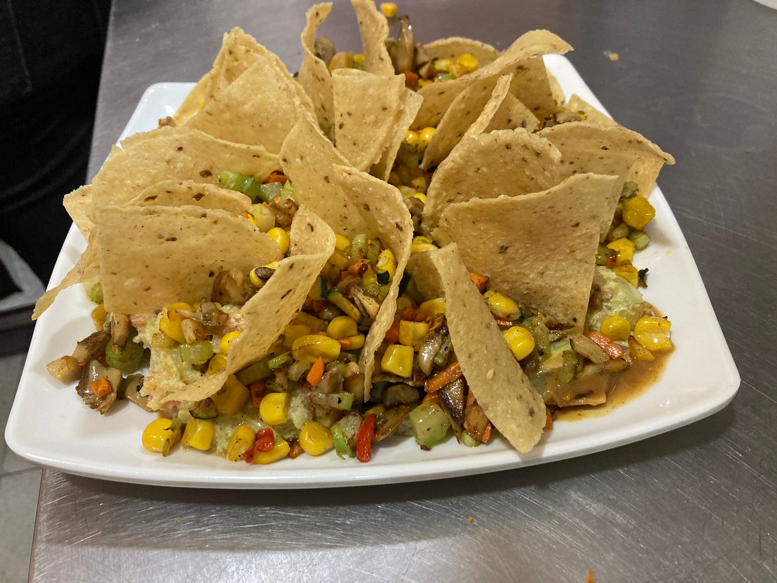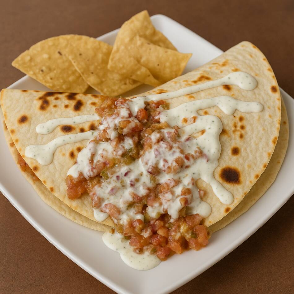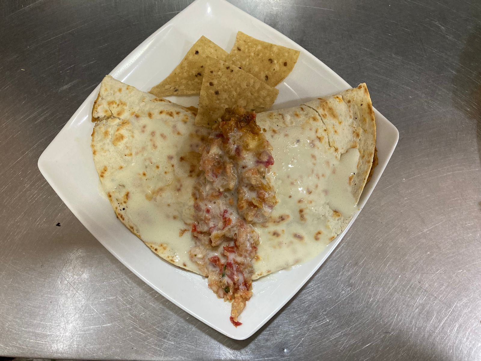 Tortilla de trigo rellena con mix de verduras, champiñón, queso derretido, pico de gallo, pimentón, frijol refrito y sour cream. Acompañado de totopos.opcional de picante habanero o jalapeño