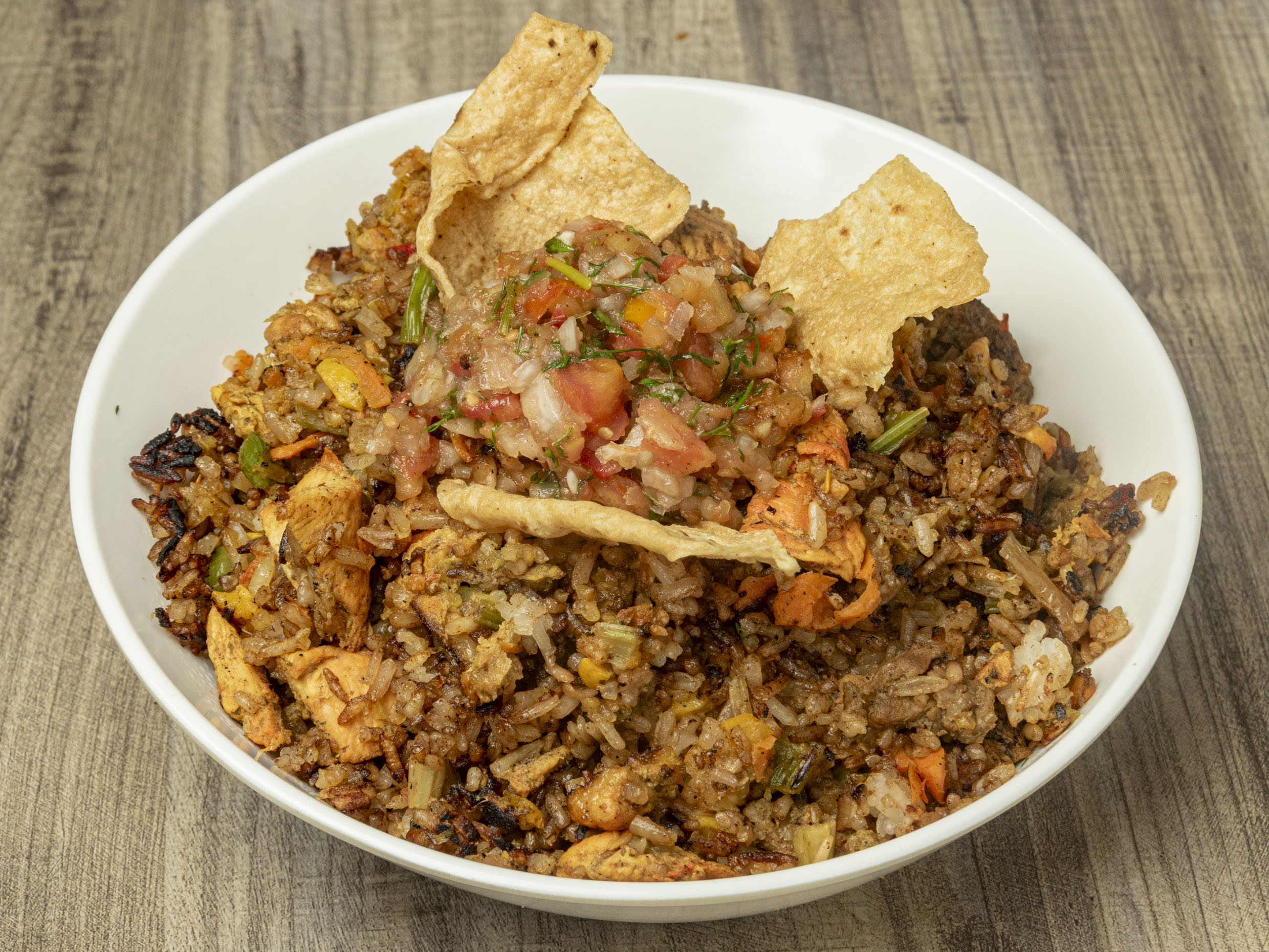 Arroz mezclado con mix de verduras acompañado con cerdo, res, pollo o mixta de dos carnes en su salsa, pico de gallo, pimentón. Acompañado de totopos