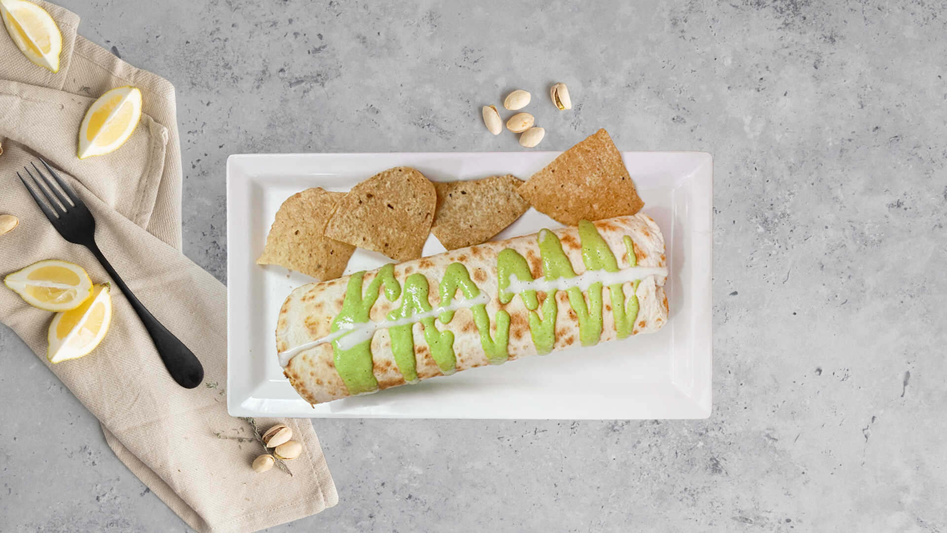 Tortilla de trigo relleno con mix de verduras, champiñón, pico de gallo, arroz o papa fosforo y lechuga. Acompañado de totopos y frijol refrito. Opcion de picante habanero o jalapeño