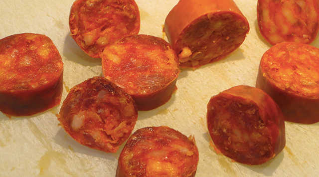 Tortilla de trigo relleno con chorizo, tocineta, pimentón, pico de gallo, arroz o papa fosforo y sour cream. Acompañado de totopos y frijol refrito. Opción de picante habanero o jalapeño peso aproximado 110 gramos