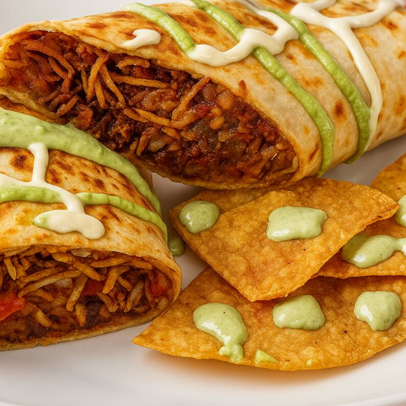 Tortilla de trigo rellena con 120 gr cerdo, res, pollo, o mixto de dos carnes en su salsa, mix de 150 gr de verduras, queso doble crema, pico de gallo, pimentón y sour cream. Acompañado de totopos y frijol refrito. Opción de picante habanero o jalapeño