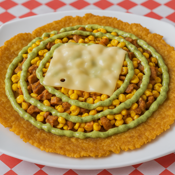 Toston de plátano verde relleno con cerdo, res, pollo o mixto de dos carnes en su salsa, pico de gallo, maíz, pimentón, queso derretido.