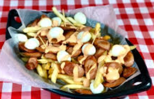 Chorizo santarosano, carne y pollo desmechado, chicharrón, tocineta, jamón, queso doble crema, papa chips, salsa de la casa y huevo de codorniz acompañado de papas a la francesa.