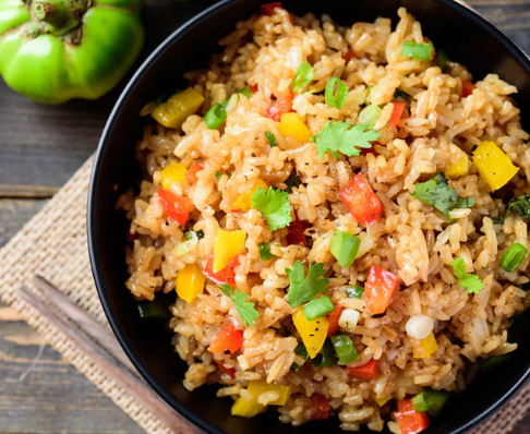 1100 g De arroz salteado con mix de vegetales (zucchini, zanahoria, cebolla, pimentón), mix de proteínas y acompañado de papas a la francesa.