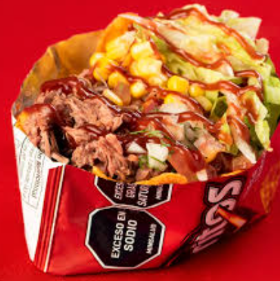 Carne desmechada, jamón, queso doble crema, pico de gallo, salsa de la casa, papa chips y huevo de codorniz.