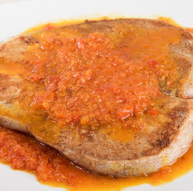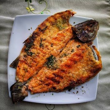 Trucha al ajillo 350grs, acompañada de arroz, ensalada, papa francesa, sopa y jugo.