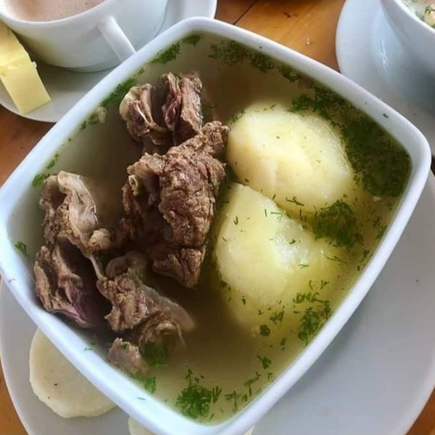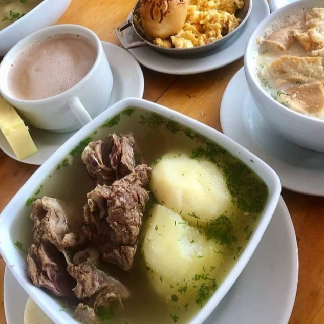Caldo de costilla, huevos al gusto y bebida caliente.