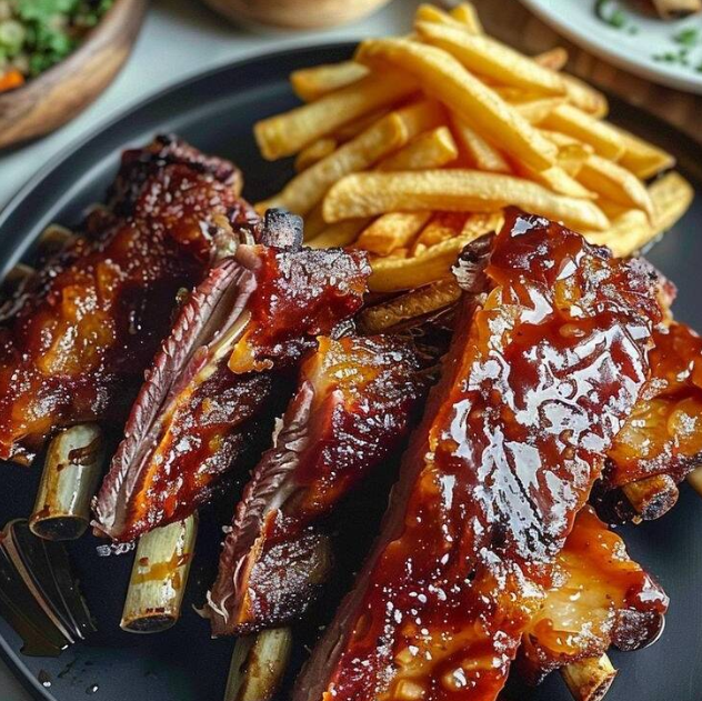 Costillas bbq 350grs, acompañada de arroz, ensalada, papa francesa, sopa y jugo.
