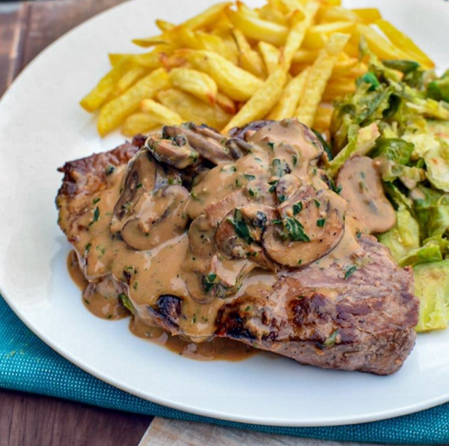 Pechuga con salsa de champiñones 200grs, acompañada de arroz, ensalada, papa francesa, sopa y jugo.